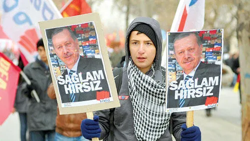 وتظاهر آلاف الأشخاص أمس في أنقرة ضد حكومة إردوغان والتي تتخبط في فضيحة فساد غير مسبوقة. وأفاد مصور وكالة الصحافة الفرنسية عن تجمع 20 ألف متظاهر تلبية لدعوة نقابات ومنظمات غير حكومية في ساحة بأنقرة مرددين «الثورة ستنظف هذه القاذورات» و«إنهم لصوص» في إشارة إلى حزب العدالة والتنمية الحاكم. ورفع متظاهرون صور دولارات رسم عليها وجه إردوغان. وأعادت فضيحة الفساد التي يشتبه بأن مقربين من رئيس الوزراء التركي متورطون فيها، حركة الاحتجاج ضد الحكومة بعد ستة أشهر من التظاهرات الحاشدة التي هزت تركيا.