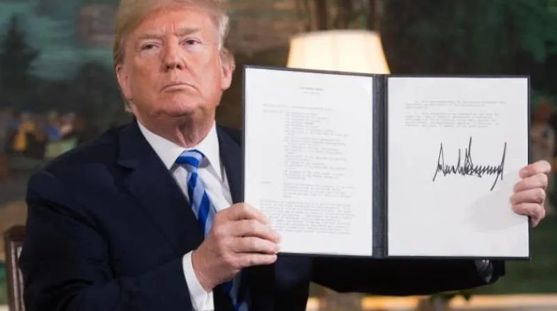 الرئيس الأميركي دونالد ترمب لدى توقيعه إعادة فرض العقوبات على إيران بعد الانسحاب من الاتفاق النووي (صورة أرشيفية - أ.ف.ب)