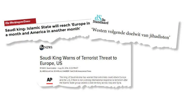فيما قالت صحيفة «فيرست وورلد» في تقرير إخباري موسع إن «الملك حذر من الإرهاب ، وإنه سيمتد إلى أوروبا وأميركا، داعيا الجميع إلى محاربته بقوة وسرعة»، وأشارت إلى قول العاهل السعودي: «أنا متأكد بعد شهر سيصلون إلى أوروبا وبعد شهر ثان إلى أميركا».