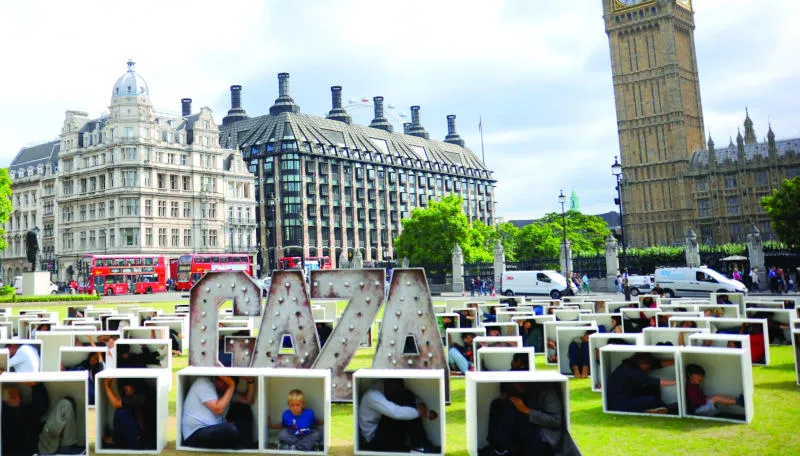 متطوعون بريطانيون يجلسون بصناديق كرتونية في ساحة البرلمان في لندن لتمثيل الأوضاع وتوضيح الظروف التي واجهها سكان غزة أثناء الحصار الإسرائيلي أمام المسؤولين البريطانيين (غيتي)