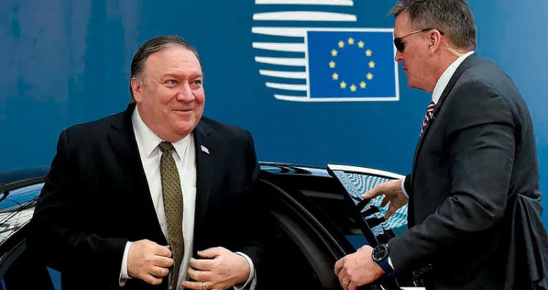 مايك بومبيو لدى وصوله إلى مقر الاتحاد الأوروبي في بروكسل أمس (أ.ف.ب)