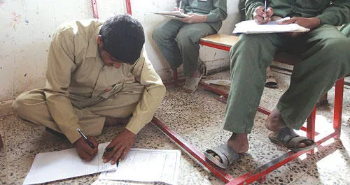 تلميذ يمني يجيب على أسئلة امتحان نصف العام جالسا على الأرض في إحدى مدارس صنعاء أمس (رويترز)