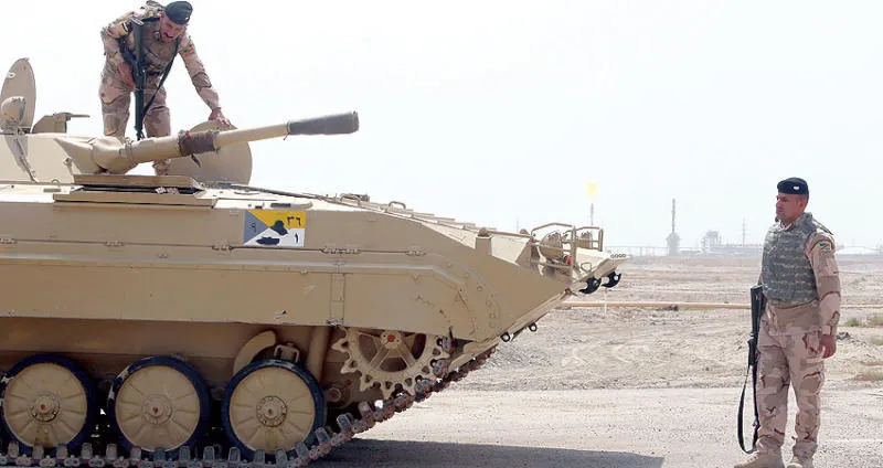 حراسة عسكرية لمدخل حقل «القرنة 1» في محافظة البصرة الذي تعمل فيه شركة «إكسون موبيل» الأميركية (رويترز)