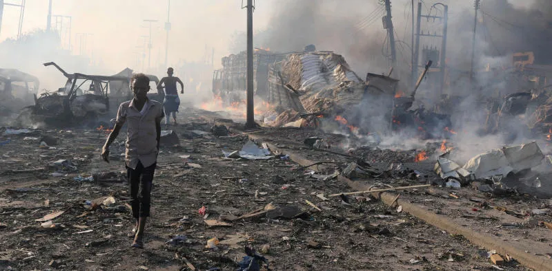 مدنيون يغادرون موقع انفجار سابق نفذته حركة الشباب في مقديشو (رويترز)