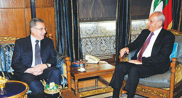 رئيس مجلس النواب اللبناني نبيه بري خلال استقباله فؤاد السنيورة رئيس كتلة المستقبل في بيروت أمس («الشرق الأوسط»)