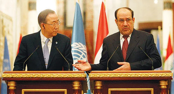 رئيس الوزراء العراقي نوري المالكي والأمين العام للأمم المتحدة بان كي مون في مؤتمر صحافي مشترك في بغداد أمس (أ.ب)