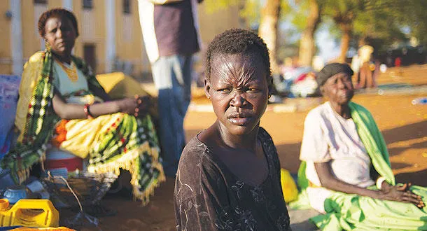 لاجئون من جنوب السودان أمام كاتدرائية {سانت تيريزا} في جوبا أمس (أ.ف.ب)