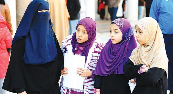 فتيات تونسيات مع والدتهن في مسجد الزيتونة في العاصمة تونس أمس للاحتفال بالمولد النبوي الشريف (أ.ف.ب)