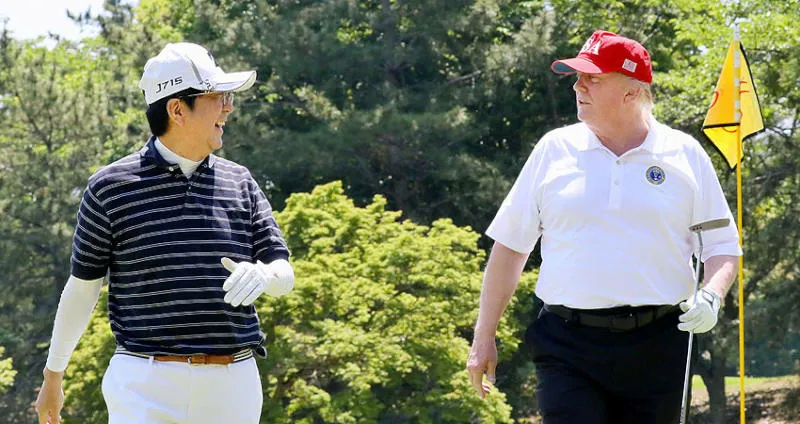وتحت سماء صافية ودرجة حرارة مرتفعة، لعب ترمب وآبي الغولف في نادي موبارا في شيبا القريبة من العاصمة طوكيو. وأظهرت صور التقطها التلفزيون الياباني من الجو الرئيسين وهما يتدربان على التلويح بمضارب الغولف، ويقومان بالقيادة في الملعب، يرافقهما لاعب الغولف المحترف إيساو آيوكي.