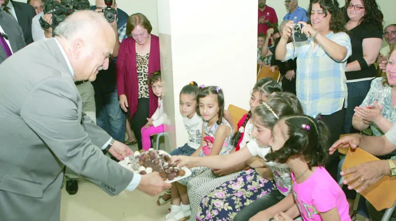 الأمير الحسن بن طلال يقدم الحلوى لأطفال عراقيين مسيحيين في عمان أمس («الشرق الأوسط»)