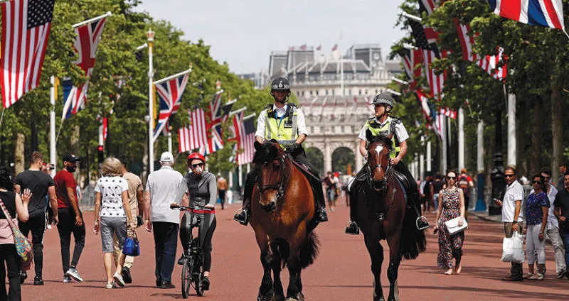 شرطيان يقومان بدورية أمنية بالقرب من قصر باكنغهام أمس (أ.ف.ب)