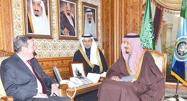 الأمير سلمان بن عبد العزيز لدى لقائه المستشار السابق لألمانيا الاتحادية (واس)