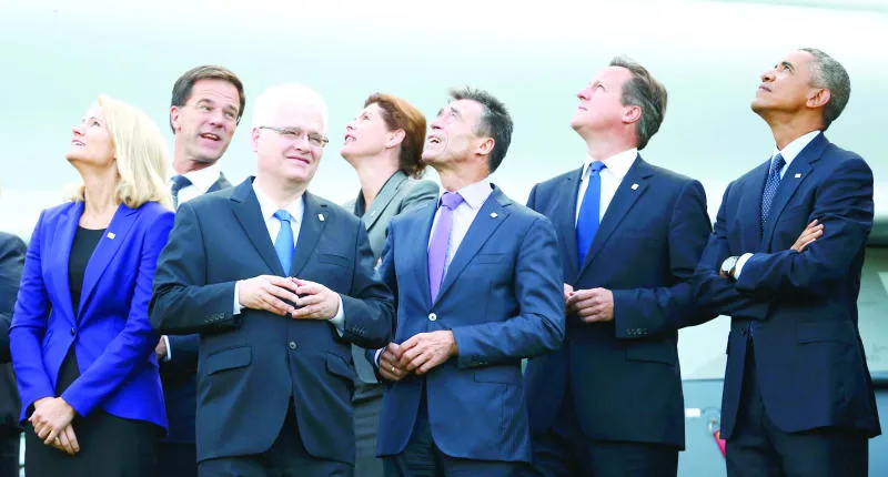 قادة دول حلف شمال الأطلسي ينظرون إلى عروض تحليق جوي في اليوم الثاني والأخير من قمتهم في نيوبورت بويلز أمس (رويترز)