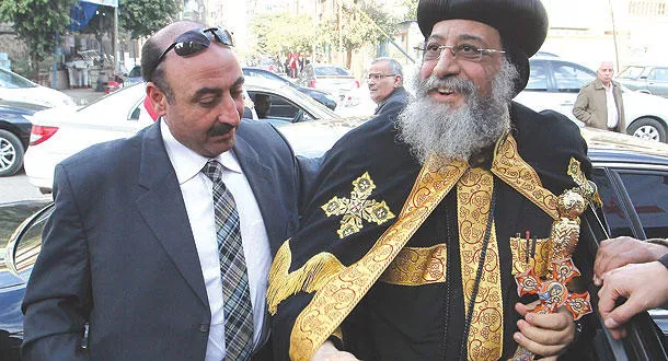 البابا تواضروس الثاني بابا الإسكندرية بطريرك الكرازة المرقسية لحظة وصوله إلى اللجنة للإدلاء بصوته أمس (إ.ب.أ)