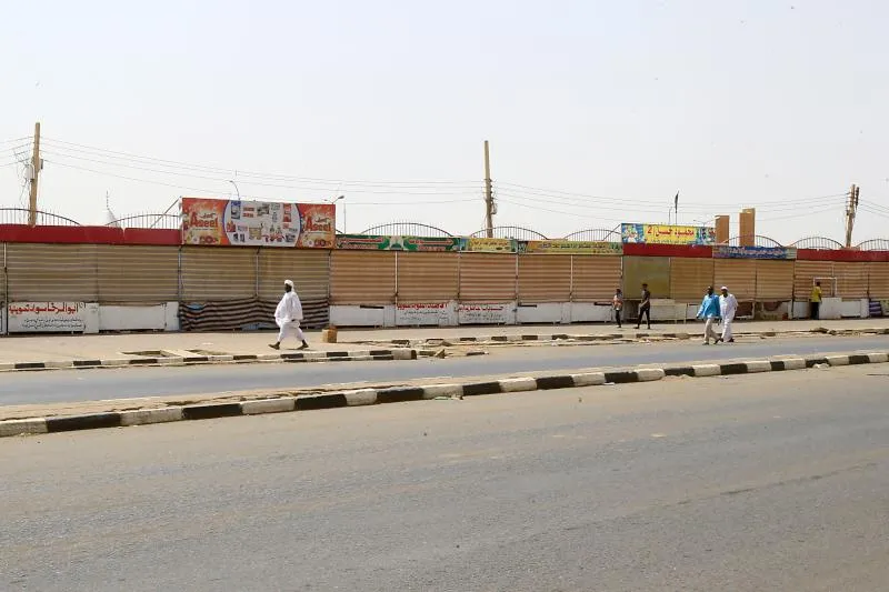 سودانيون يمرون بجانب متاجر مغلقة في سوق مدينة أم درمان في أول أيام العصيان المدني (أ.ف.ب)