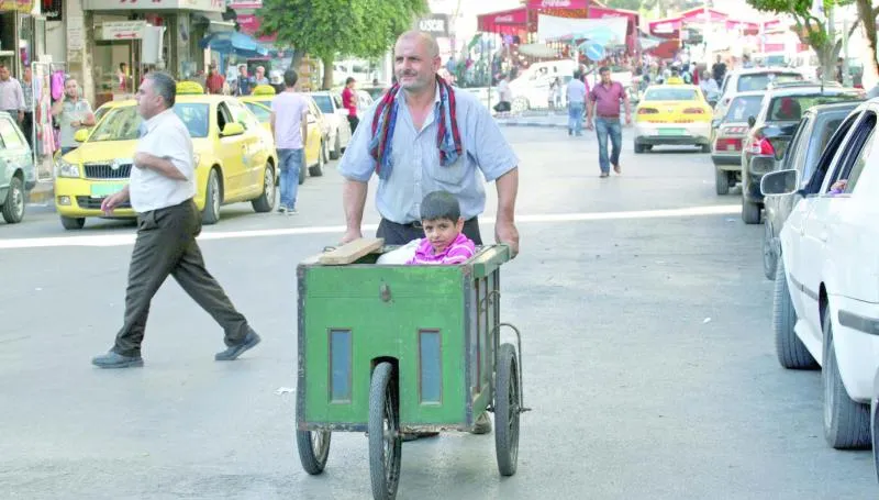 فلسطيني يدفع نجله بعربة في سوق بمدينة نابلس في الضفة الغربية أمس (أ.ب)