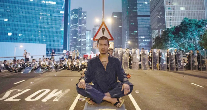 متظاهر يجلس أمام متظاهرين ورجال أمن عقب يوم من المواجهات في هونغ كونغ الأربعاء (أ.ف.ب)