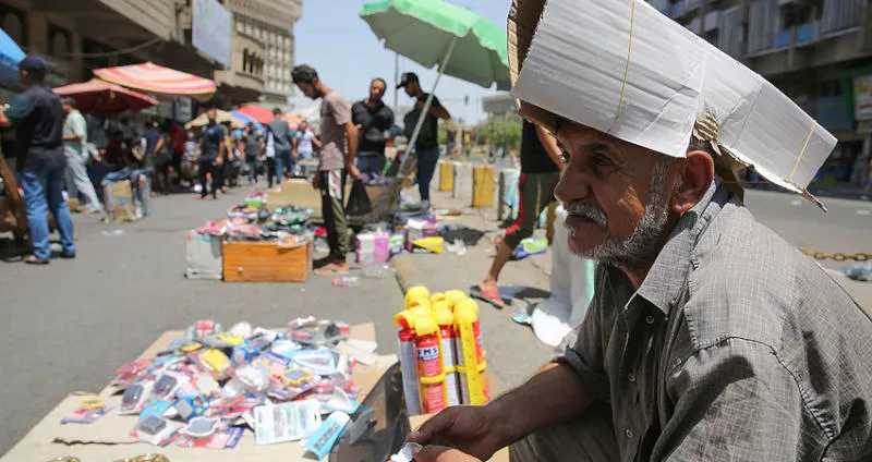 بائع عراقي يحمي رأسه بقبعة ورقية خلال موجة حر ضربت بغداد أمس (أ.ف.ب)