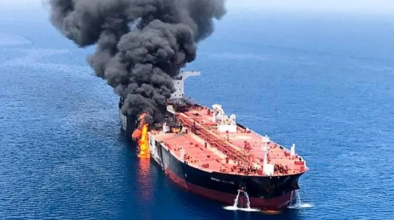 اشتعال النيران في ناقلة نفط بعد تعرضها لهجوم في خليج عمان (صورة أرشيفية - رويترز)