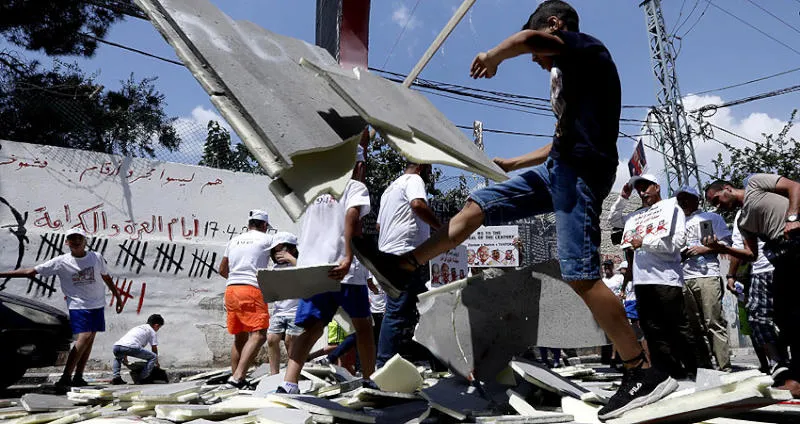 فلسطينيون يكسرون مجسماً للحائط الفاصل أثناء احتجاجات في بيت لحم أمس (إ.ب.أ)