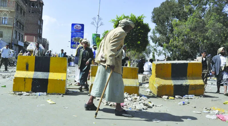 مسن يمني يمر أمام متحجين من الحوثيين في صنعاء أمس (إ.ب.أ)