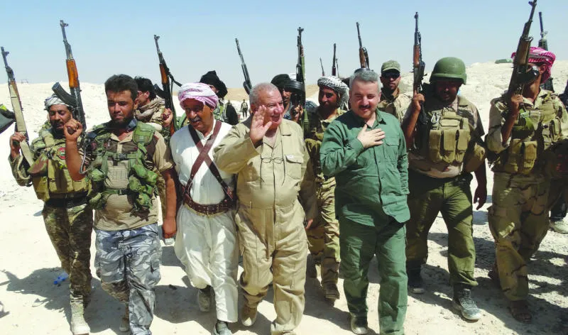محافظ الأنبار أحمد الدليمي (الثالث من اليمن) لدى زيارته مع مسؤولين أمنيين وشيوخ عشائر موقعا أمنيا قرب حديثة أول من أمس قبل إصابته بجروح في سقوط قذيفة هاون أطلقها مسلحو «داعش» (أ.ف.ب)