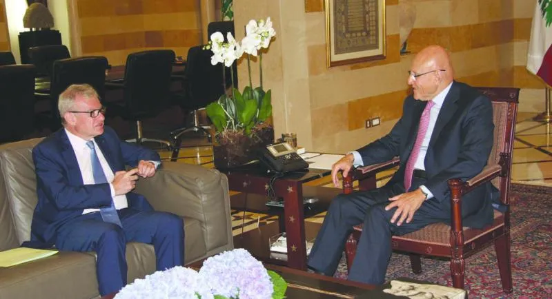 رئيس الحكومة اللبنانية تمام سلام لدى لقائه السفير الفرنسي لدى لبنان باتريس باولي في بيروت أمس (دالاتي ونهرا)