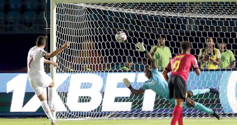 المسكاني قائد منتخب تونس يسجل من ركلة الجزاء في مرمى أنغولا (رويترز)