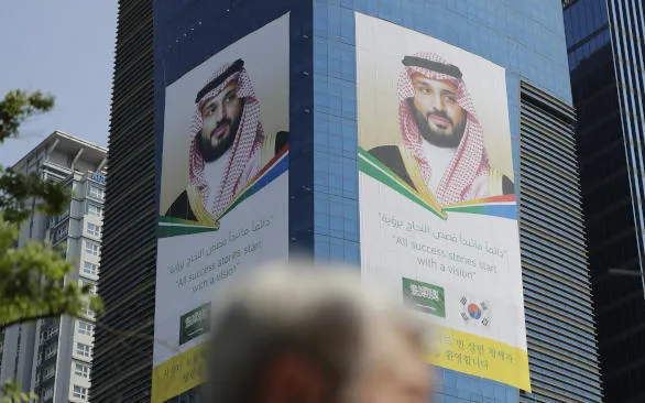 لافتات ضخمة في سيول ترحّب بزيارة ولي العهد السعودي الأمير محمد بن سلمان لكوريا (آ.ب)