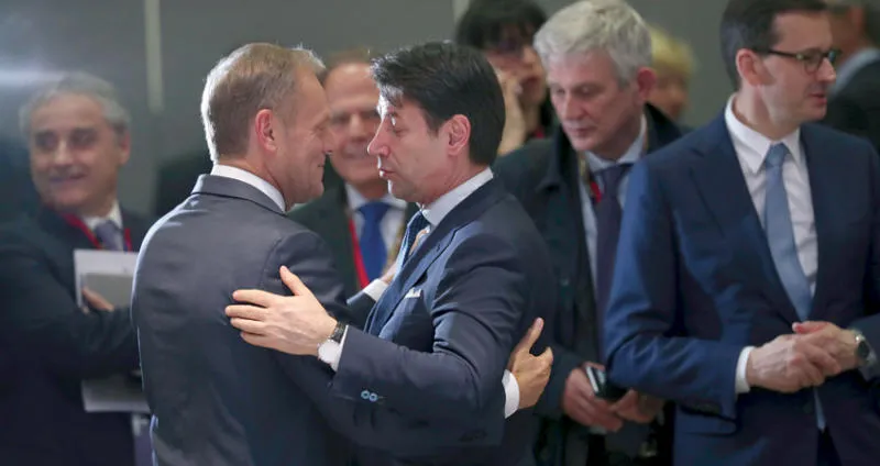 رئيس وزراء إيطاليا جوزيبي كونتي مع رئيس المجلس الأوروبي دونالد توسك (إ.ب)