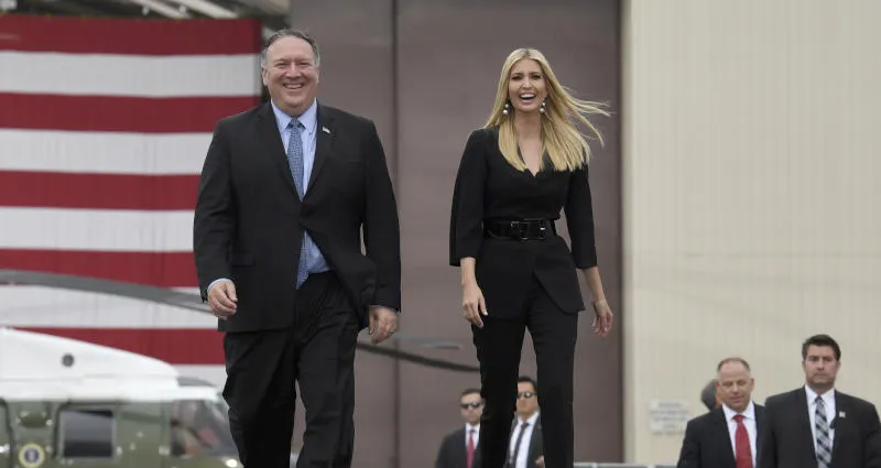 إيفانكا ترمب ومايك بومبيو وزير الخارجية الأميركي قبل صعودهما المنصة في قاعدة «أوسان» الجوية (أ.ب)