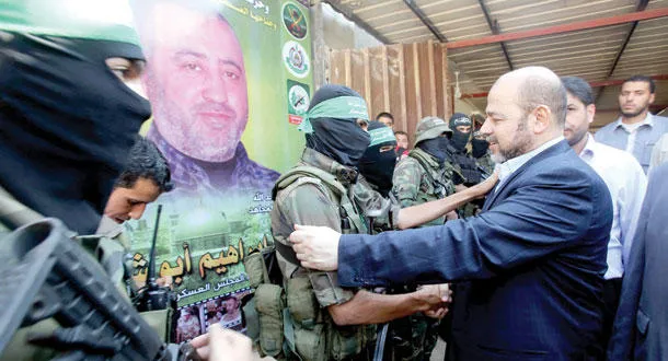 موسى أبو مرزوق يصافح جنديا خلال مراسيم تأبين محمد أبو شمالة الذي قتل على أيدي قوات الاحتلال الاسرائيلي في رفح (رويترز)