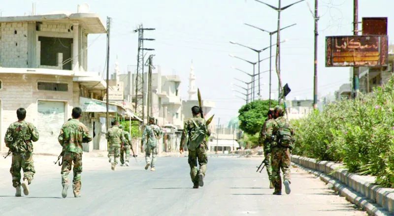 جنود سوريون تابعون للنظام في دورية بمنطقة حلفايا بريف حماه بعد اعادة السيطرة عليها (أ.ف.ب)