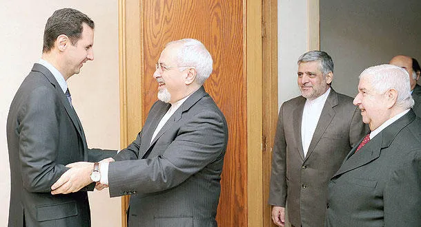 الرئيس السوري بشار الأسد ووزير الخارجية الإيراني جواد ظريف لدى لقائهما وفي اليسار وزير الخارجية السوري وليد المعلم، والسفير الإيراني محمد رضا شيباني في دمشق أمس (أ.ف.ب)
