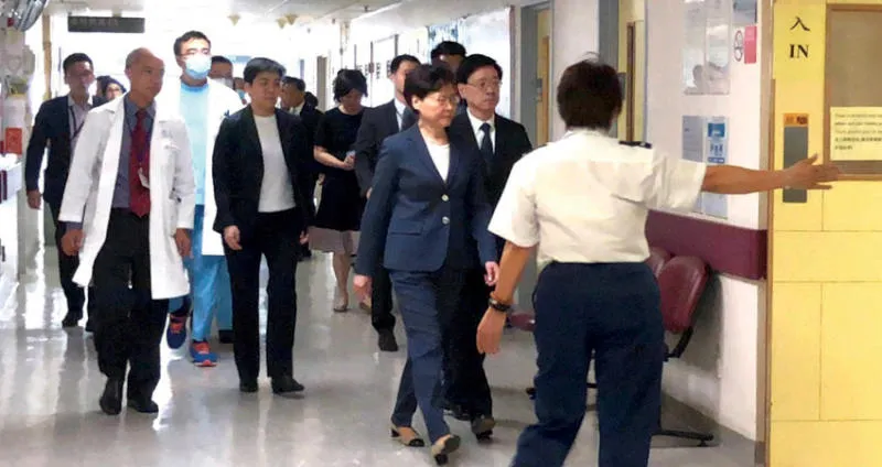 كاري لام لدى زيارتها أفراداً من الشرطة أُصيبوا خلال المواجهات أمس (رويترز)