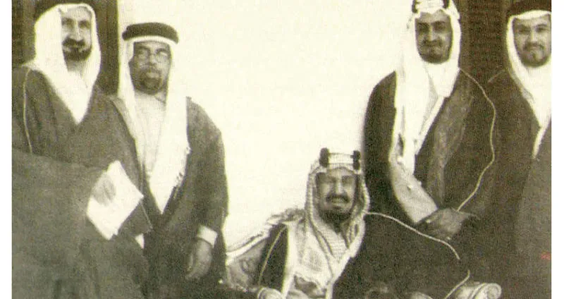الملك عبد العزيز وإلى يساره ابنه الملك فيصل الذي شغل منصب نائب الملك في الحجاز