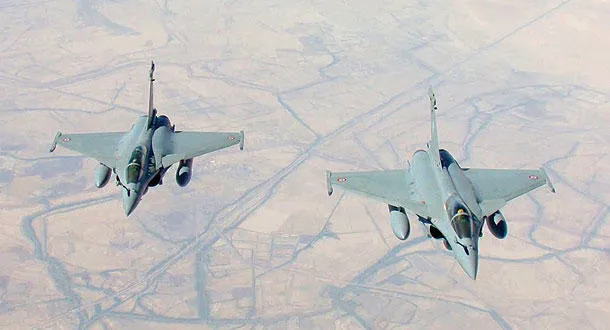 مقاتلتان فرنسيتان انطلقتا من قاعدة «الظفرة» بدولة الإمارات تقومان بطلعة استكشافية فوق العراق أول من أمس (أ.ف.ب)
