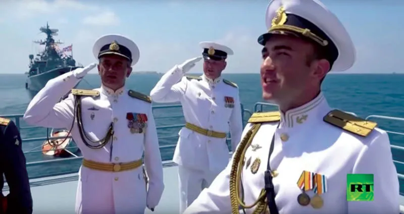 صورة مقتطعة من فيديو لاحتفال ضباط روس في قاعدة طرطوس بسوريا أمس بـ«يوم الأسطول» (عن «روسيا اليوم»)