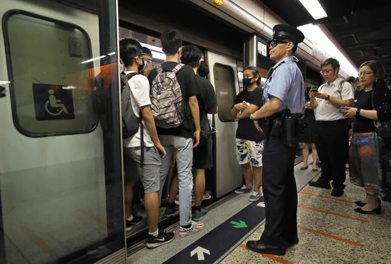 الشرطة تقف إلى جانب محتجين يعطلون حركة المترو في هونغ كونغ (أ.ب)