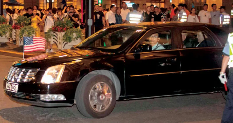سيارة تقل بعضاً من أعضاء الوفد التجاري الأميركي إلى مقر المفاوضات في شنغهاي أمس (أ.ف.ب)