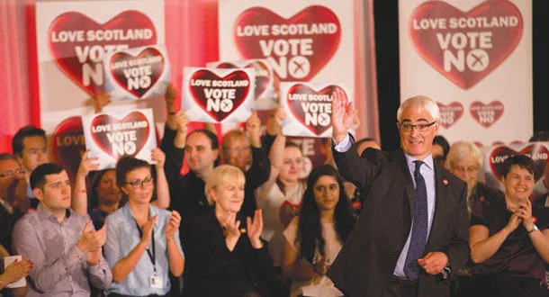 وزير الخزانة البريطاني السابق أليستر دارلينغ يشير بيده في ختام كلمة له أمام حشد من الرافضين للانفصال في غلاسكو أمس (أ.ب)