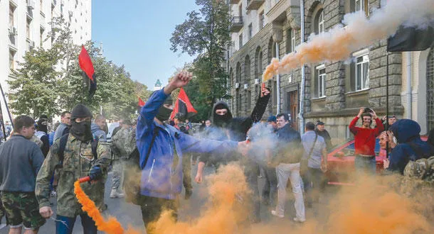 أنصار للأحزاب اليمينية المتطرفة الأوكرانية لدى تظاهرهم قرب مقر الرئاسة في كييف أمس احتجاجا على عزم الرئيس بوروشينكو العفو عن المقاتلين الانفصاليين في مناطق الشرق (إ.ب.أ)