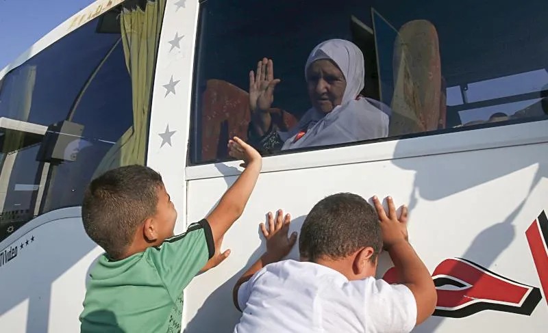 طفلان يودّعان إحدى قريباتهما التي تغادر إلى الأراضي المقدسة (أرشيف - أ.ف.ب)
