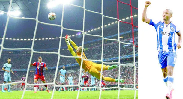 الجزائري إبراهيمي يحتفل بثلاثيته مع بورتو (إ.ب.أ) - هارت حارس مانشستر سيتي في محاولة فاشلة للتصدي لتسديدة بواتينغ التي منحت بايرن الفوز (رويترز)