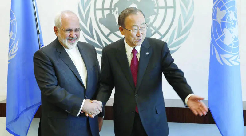 الأمين العام للأمم المتحدة بان كي مون يستقبل وزير الخارجية الإيراني محمد جواد ظريف في مقر الامم المتحدة بنيويورك أمس (أ.ب)