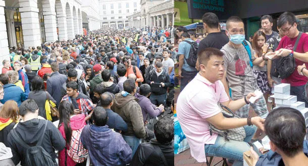 تجار صينيون يشترون هواتف «آيفون» 6 و«آيفون 6 بلاس» من الناس الذين اشتروه من متجر آبل في هونغ كونغ لبيعه في الصين (رويترز) - مئات من البريطانيين أمام متجر آبل في كوفنت غاردن في العاصمة لندن (أ.ب)