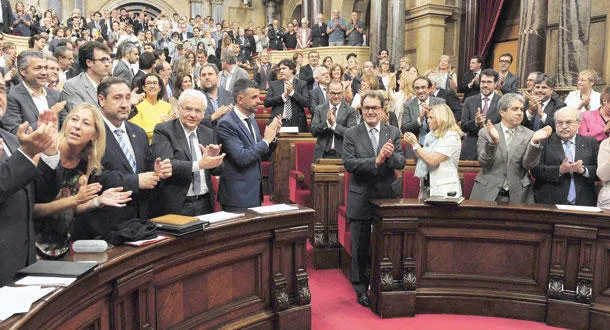 رئيس إقليم كتالونيا آرتور ماس (الرابع من اليمين) ونواب يصفقون بعد موافقة البرلمان الإقليمي، في برشلونة أمس، على قانون لتنظيم الاستفتاء في 9 نوفمبر المقبل (أ.ف.ب)