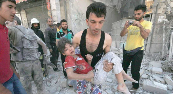 سوري يحمل طفلة مصابة بعد قصف قوات النظام السوري لمناطق في حلب بالبراميل المتفجرة أمس (رويترز)