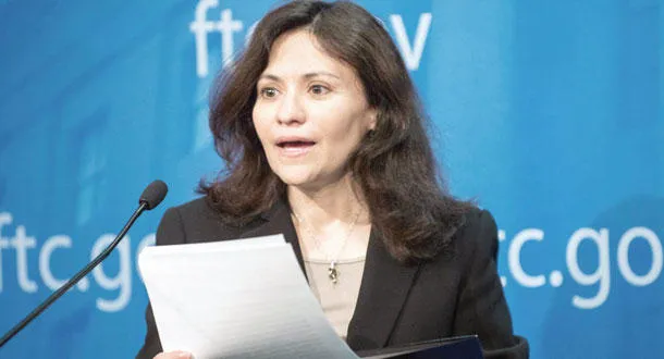 إديث راميريز رئيسة هيئة التجارة الاتحادية خلال المؤتمر الصحافي في مقر الهيئة في واشنطن وأعلنت فيه موافقة شركة «أبل» على دفع التعويضات (أ.ف.ب)