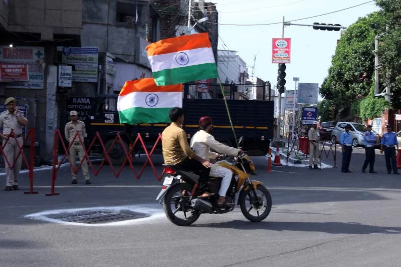 رجلان هنديان يحملان الأعلام الوطنية على دراجتهما النارية في أحد شوارع جامو احتفالاً بعيد الاستقلال (وكالة الصحافة الفرنسية أ.ف.ب)